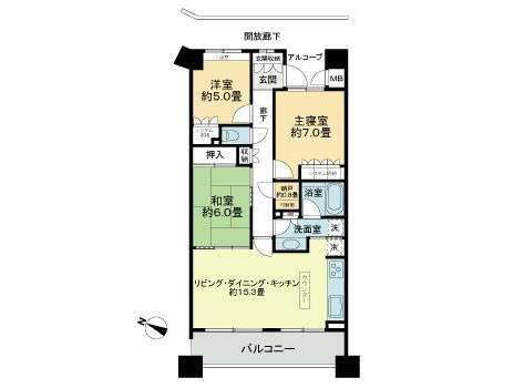 | 詳細間取 | 3LDK (和6帖×1、洋7帖×1、洋5帖×1、LDK15.3帖) | ||